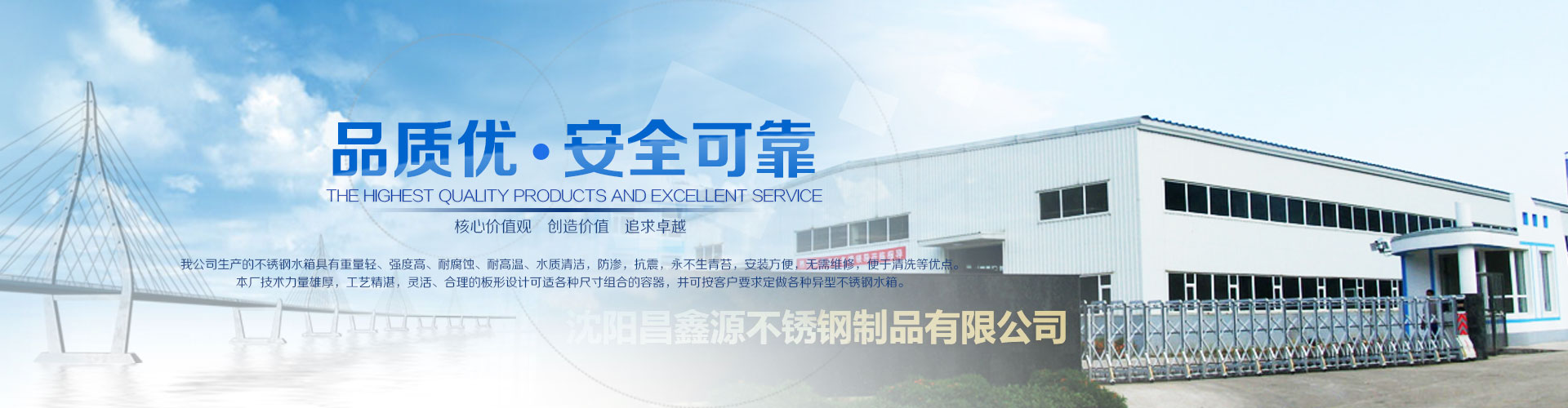 沈陽(yáng)市昌鑫源不銹鋼制品有限公司成立于1999年,是集不銹鋼水箱開(kāi)發(fā)設(shè)計(jì)、生產(chǎn)、銷(xiāo)售、售后服務(wù)為一體的公司。本廠(chǎng)引進(jìn)國(guó)內(nèi)先進(jìn)生產(chǎn)設(shè)備,生產(chǎn)不銹鋼保溫水箱、消防水箱、太陽(yáng)能水箱、組合式不銹鋼水箱、不銹鋼罐、白鋼運(yùn)輸罐、白鋼過(guò)濾槽、白鋼管道、彩鋼房等白鋼制品。